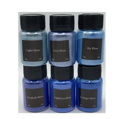 Mica powder set of 6 colours: Purplish Blue Sky Blue Light Blue Indigo Blue Zinc Blue Sapphire Blue Each bottle includes 10g of mica powder. Amount of...